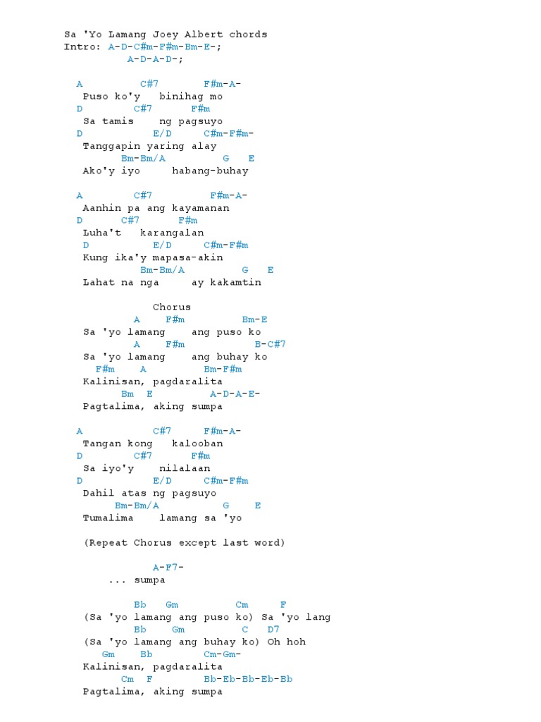 Am Fm Ikaw na ang may sabi Bm E na akoy mahal mo rin Am Fm At sinabi mong Bm E ang pag ibig moy di mag babago Dm Dm Am A Ngunit bakit sa twing akoy lumalapit ikay lumalayo Dm Dm Am A Pusoy laging nasasaktan pag may kasama kang iba Bm Cm Dm Di ba nila alam Bm Cm Dm tayoy nag sumpaan D na akoy sayo. Na akoy sa iyo Dm Intro Ikay akin lamang 1st stanza chords Kahit anong mangyari Pag-ibig koy sa yo pa rin Kahit ano pa Ang sabihin nilay ikaw pa rin. Hehehe Intro 1-.